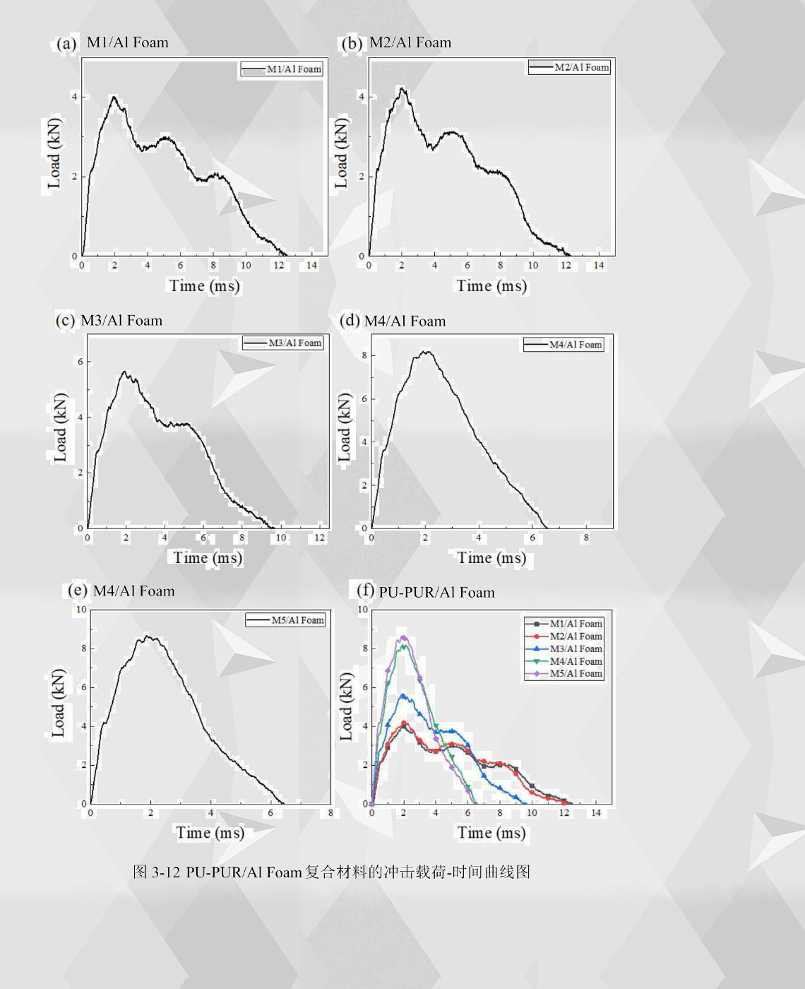綜合從載荷-時間曲線來看,M4/Al Foam和M5/Al Foam的到達峰值載荷時間更快,峰值載荷都很高,沖擊持續時間較短,說明這兩種復合材料在受到沖擊荷載時可以更快速地響應而具有更高的抗沖擊能力。