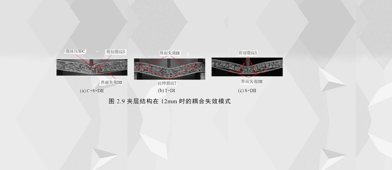 在汽車結(jié)構(gòu)碰撞過程中,對沖擊動能的吸收主要是通過結(jié)構(gòu)的塑性變形以及材料的破壞,因此對泡沫鋁夾層結(jié)構(gòu)彎曲工況的后屈服變形及失效模式的研究是很有必要的。為了區(qū)分臨界失效模式和后屈服失效模式,定義耦合失效模式用來描述夾層結(jié)構(gòu)在彎曲位移為12mm時的失效模式。從各夾層結(jié)構(gòu)的耦合失效模式可以看出,其失效模式是十分復(fù)雜的,經(jīng)分析可知,耦合失效模式主要是由前文描述的臨界失效模式演變的失效模式組合。為了清楚地描述各試件的耦合失效模式,用幾個字符來表示特定的破壞形式:C代表壓頭正下方芯層有明顯壓縮,屬于臨界失效模式IN的演變,S代表壓頭附近芯層有剪切裂紋,T代表支撐端附近芯層有拉伸裂紋,D代表界面失效,屬于臨界失效模式DB的演變,此外,界面失效在上部和下部的破壞位置分別用羅馬數(shù)字I和Ⅱ分別代表上界面和下界面失效,為了直觀地顯示耦合失效模式的特征,圖2.9中顯示了夾層結(jié)構(gòu)在12mm時幾種典型的耦合失效模式。在鋁合金夾層結(jié)構(gòu)中,只有試件AL-F2和AL-D25的耦合失效模式僅為其本身的臨界失效模式演變,并未夾雜其他失效模式。所有纖維增強夾層結(jié)構(gòu)的耦合失效模式都存在壓頭下方芯層壓縮,并且在壓頭附近均具有剪切裂紋以及沒有界面失效(GF-F1的耦合失效模式中僅出現(xiàn)一種失效模式)。