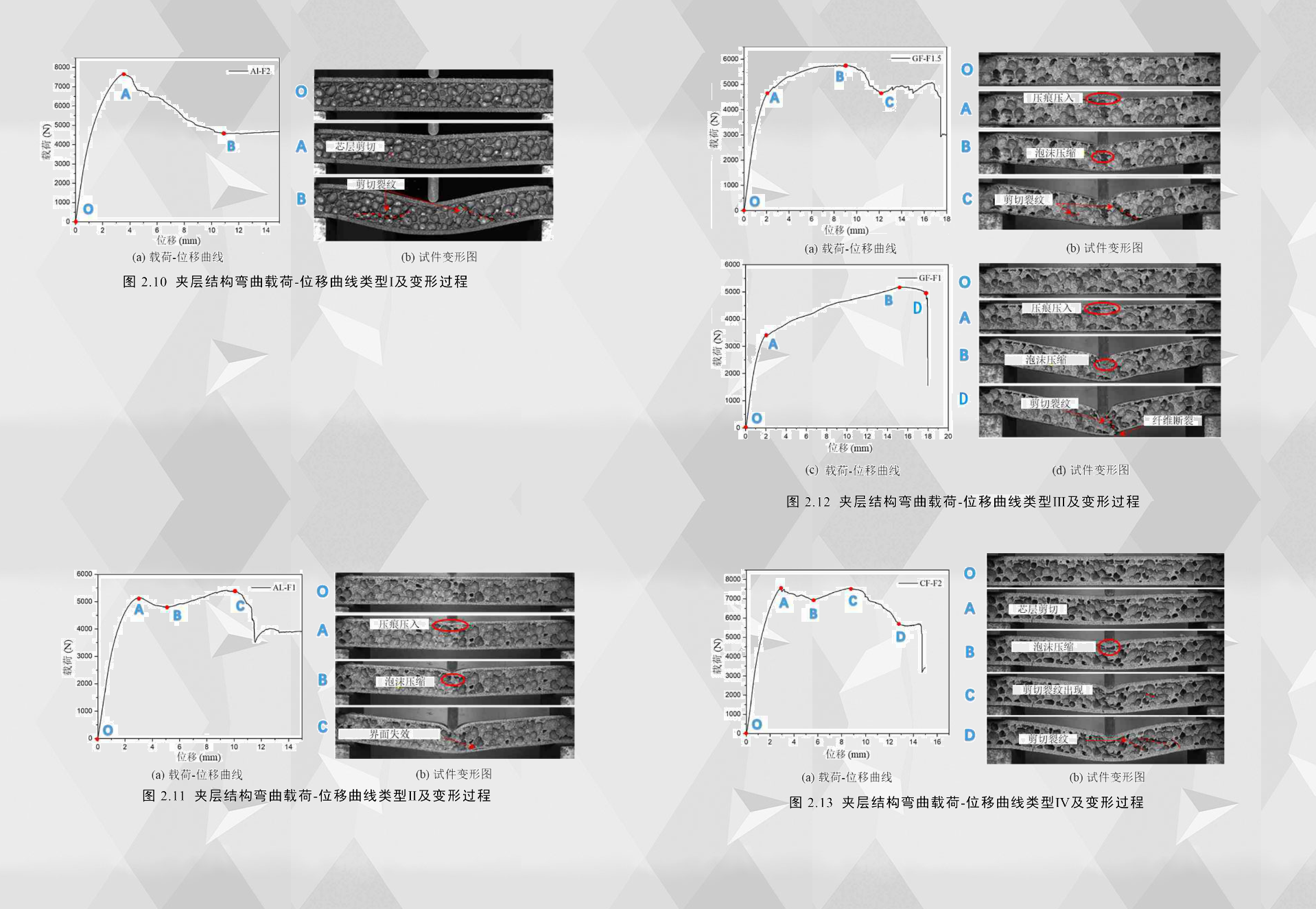 為了研究臨界失效模式對后繼載荷-位移曲線和后屈曲變形的影響,圖2.10-2.13展示了泡沫鋁夾層結(jié)構(gòu)三點彎曲的幾種典型荷載-位移曲線及其變形時刻圖,本章中的曲線與以往的相關(guān)研究有一定的差異,這些載荷-位移曲線沒有明顯的面板拉伸以及在初始失效模式之后的后續(xù)硬化行為,這是由于在實驗過程中夾層結(jié)構(gòu)試件與試驗夾具的夾持端之間存在相對滑動。根據(jù)夾層結(jié)構(gòu)的臨界失效模式和載荷-位移曲線分析可知,具有相同面板材料但不同臨界失效模式夾層結(jié)構(gòu)的荷載-位移曲線差異很大,并且具有相同臨界失效模式但面板材料不同的夾層結(jié)構(gòu)之間荷載-位移曲線也有一定差異,因此根據(jù)面板材料和曲線形狀不同可以將泡沫鋁夾層結(jié)構(gòu)準(zhǔn)靜態(tài)彎曲試驗的載荷-位移曲線分為四類,分別為類型I、Ⅱ、Ⅲ和IV,載荷-位移曲線類型I和Ⅱ為鋁合金夾層結(jié)構(gòu)所特有,類型Ⅲ和IV 為纖維增強(qiáng)夾層結(jié)構(gòu)所特有,各曲線類型的特點及臨界失效模式分析如下: