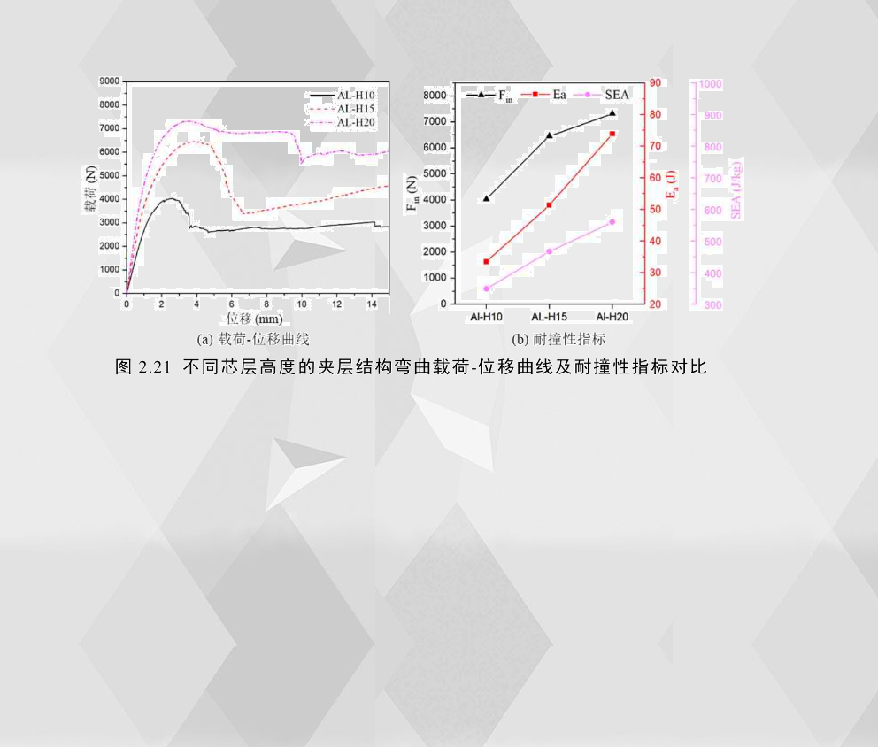 為了研究芯層對(duì)夾層結(jié)構(gòu)力學(xué)性能的影響,分別比較了不同芯層高度和不同芯層密度的鋁合金夾層結(jié)構(gòu)的載荷-位移曲線及耐撞性指標(biāo),如圖2.21和圖2.22所示。芯層高度為10mm的AL-H10和芯層高度為15mm的AL-H15的載荷位移曲線屬于類型I,芯層高度為20mm的AL-H20的屬于類型Ⅱ;AL-H10的臨界失效模式為下界面分離(DB),AL-H15的臨界失效模式為芯層剪切(CS),AL-H20臨界失效模式為壓痕壓入(IN)。從耐撞性指標(biāo)圖中可以看出,試件的芯層高度從10mm到20mm,其臨界失效載荷、總吸能和比吸能分別提高了81.27%、120.97%和60.68%,因此,鋁合金夾層結(jié)構(gòu)的臨界載荷、總吸能和比吸隨芯層厚度而增加,其臨界失效模式從界面分離(DB)轉(zhuǎn)為芯層剪切(CS)再到壓痕壓入(IN)。表2.7總結(jié)了三種芯層高度的鋁合金夾層結(jié)構(gòu)具體的臨界載荷、總吸能、比吸能和平均載荷值。
